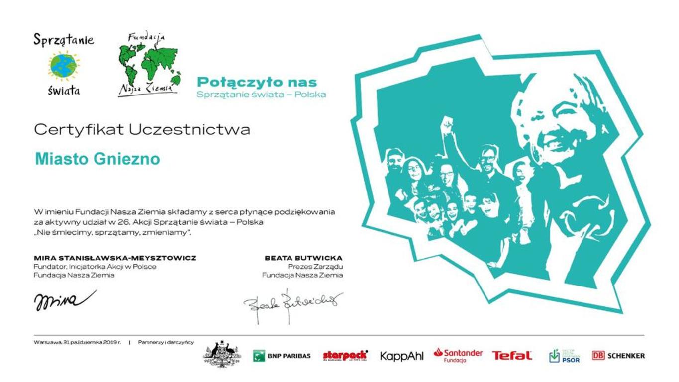 Miasto Gniezno otrzymało podziękowania z Fundacji Nasza Ziemia za udział w tegorocznej Akcji Sprzątania Świata, które w tym roku odbywało się pod hasłem: „Nie śmiecimy, sprzątamy, zmieniamy”. Podziękowania należą się dla wszystkich mieszkańców naszego Miasta, którzy włączyli się w tegoroczną akcję sprzątania naszego miasta.