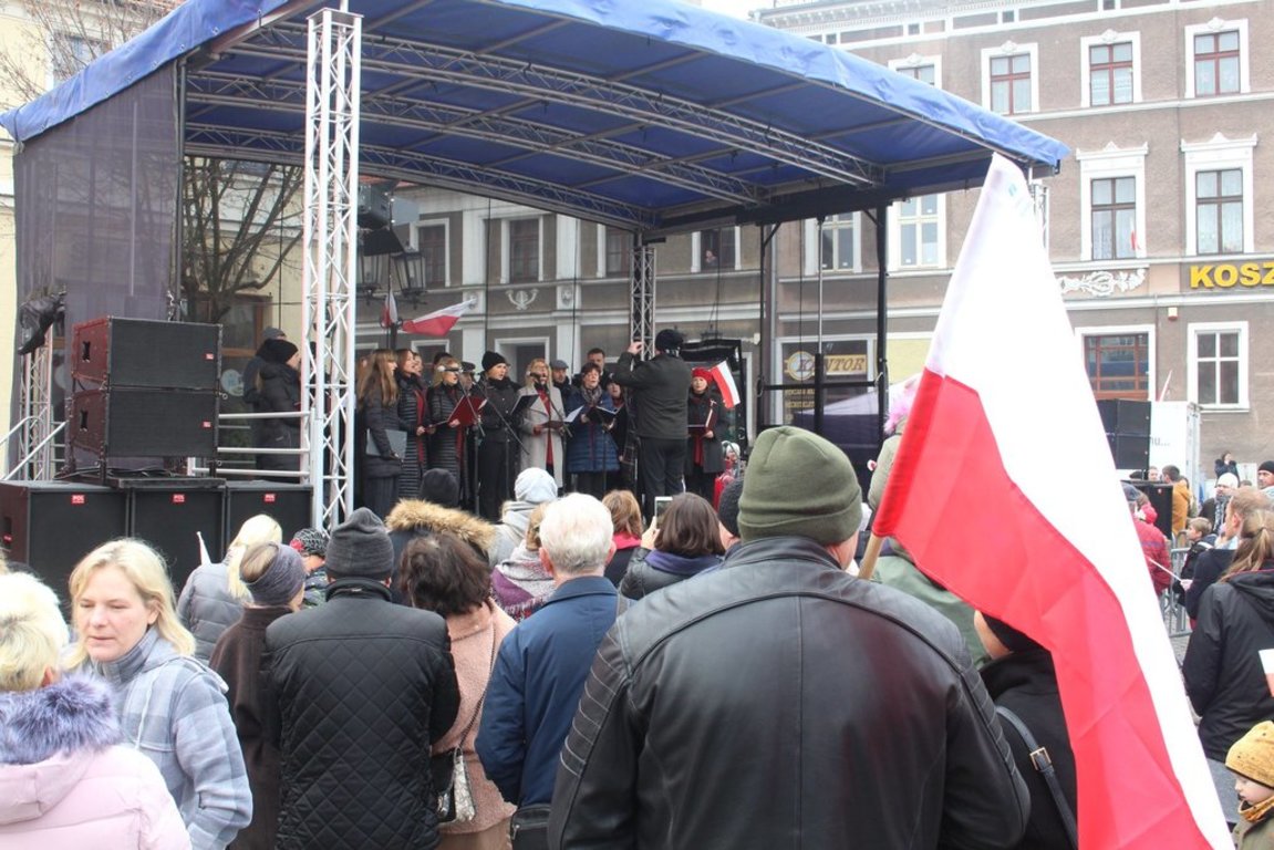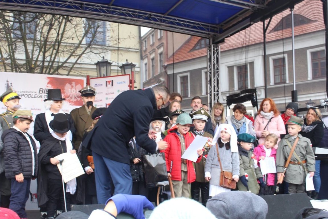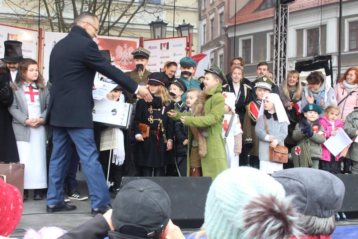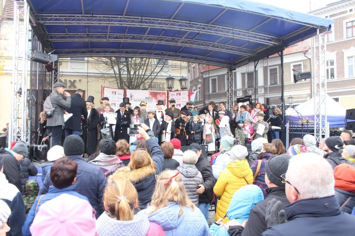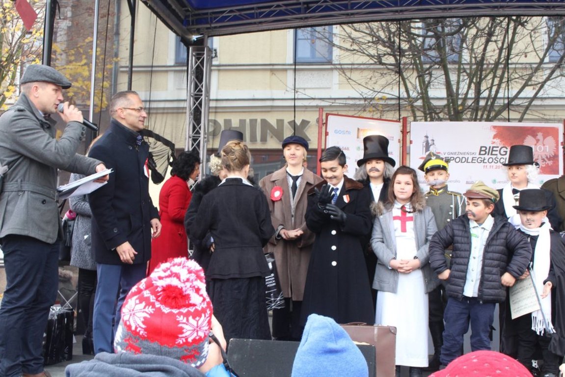 Mimo panującego chłodu, gnieźnianie zgromadzili się o godzinie 12:00 u progu gnieźnieńskiej katedry, by wspólnie odśpiewać Hymn. Dalsza część wydarzeń odbywających się na Rynku miała charakter mniej oficjalny, ale równie ważny, bo oto po koncercie mieszanego chóru Metrum zaprezentowały się dzieci i młodzież gnieźnieńskich przedszkoli i szkół podstawowych wcielająca się w wybrane postaci związane z początkami naszej. Po podsumowaniu biegu i wręczeniu nagród dla najlepszych sportowców, gnieźnianie i przybyli goście wspólnie z chórem odśpiewali kilka z utworów patriotycznych, po których na scenie zaprezentował się zespół folklorystyczny Obertas.