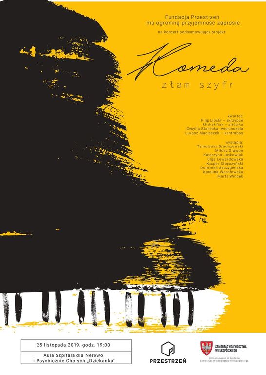 Fundacja Przestrzeń serdecznie zaprasza na podsumowanie swojego kolejnego działania! W poniedziałek, 25 listopada, o 19:00 w auli Wojewódzkiego Szpitala dla Nerwowo i Psychicznie Chorych przy ul. Poznańskiej odbędzie się koncert utworów Krzysztofa Komedy-Trzcińskiego, pisanych do polskich i zagranicznych filmów.