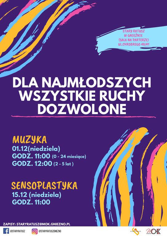 Cykl dla najmłodszych „Wszystkie ruchy dozwolone” powoli wpisał się na dobre w kalendarz warsztatów familijnych proponowanych przez Stary Ratusz. Zapraszamy na drugą grudniową sensoplastykę, która odbędzie się 15.12, w niedzielę, o 11:00. Tym razem będzie wyjątkowo świątecznie i tradycyjnie. Warto pojawić się ze szkrabami w wieku 6 miesięcy do 4 lat, wcześniej wpisując się na listę uczestników za pomocą maila: staryratusz@mok.gniezno.pl bądź na fb Starego Ratusza.