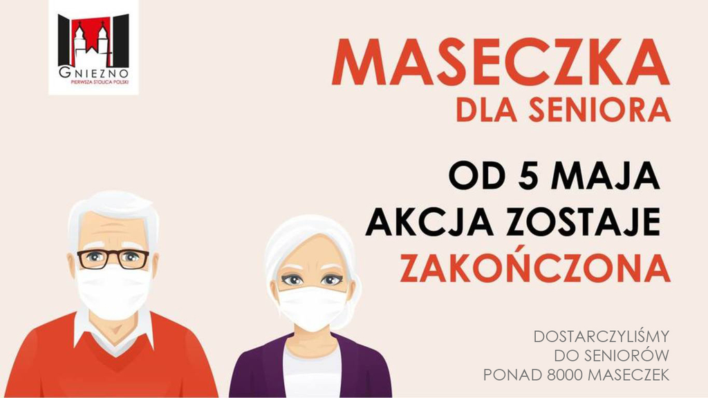 Informujemy, że 5 maja zakończona zostaje akcja „Maseczka dla seniora”. W jej trakcie udało nam się bezpiecznie dostarczyć ponad 8 tysięcy maseczek do gnieźnieńskich seniorów.