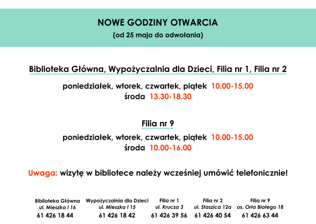 Obecna sytuacja jest dynamiczna – dlatego Biblioteka Publiczna Miasta Gniezna na bieżąco reaguje na wszystkie zmiany oraz sygnały od czytelników. I taką zmianę – korzystną dla czytelników – wprowadza od tego tygodnia. Wszystkie placówki Biblioteki, poza Filią nr 9 na Winiarach (os. Orła Białego 18), w środę będą otwarte po południu - od 13.30 do 18.30. W pozostałe dni Biblioteka jest czynna bez zmian: od 10.00 do 15.00.