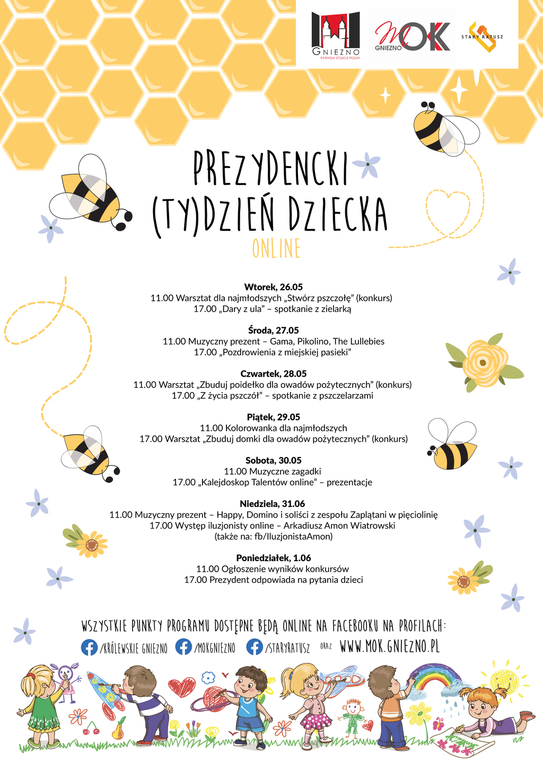 Dla najmłodszych przewidziano konkursy, warsztaty oraz zajęcia plastyczne i muzyczne. Specjalnymi wydarzeniami, na które szczególnie serdecznie zapraszamy, będą występ iluzjonisty na żywo oraz transmisja ze spotkania z Prezydentem, który odpowie na pytania nadesłane do niego przez dzieciaki.