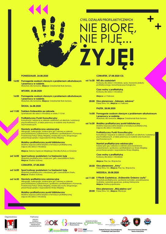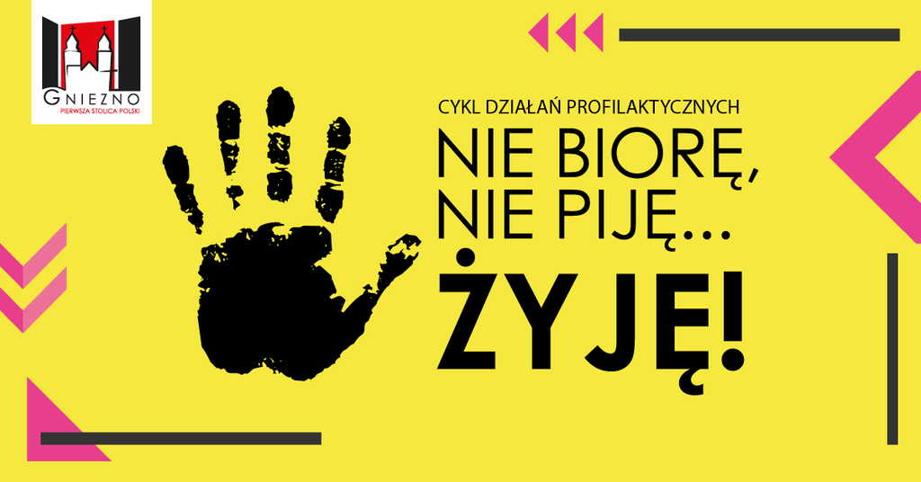 Cykl działań profilaktycznych „Nie biorę, nie piję… żyję!” – pod taką nazwą Urząd Miejski w Gnieźnie organizuje szereg inicjatyw, poruszających tematykę zapobiegania uzależnieniom, na które zapraszamy mieszkańców Gniezna. W programie znajdą się wydarzenia skierowane dla osób w każdym wieku: pokazy kina letniego, warsztaty, spartakiada, konsultacje psychologiczno-pedagogiczne, gry i zabawy.