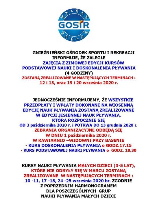 Poniżej załączamy komunikat Gnieźnieńskiego Ośrodka Sportu i Rekreacji dotyczący zaległych godzin nauki w ramach prowadzonych na basenie kursów pływania.