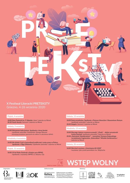 Spotkania autorskie, slam poetycki oraz nietuzinkowe koncerty, to tylko niektóre z pozycji programu tegorocznego, jubileuszowego Festiwalu Literackiego „Preteksty”. Wśród zaproszonych gości, którzy przyjadą do Pierwszej Stolicy, możemy wymienić Annę Seniuk, Sławomira Shutego, Olgę Gitkiewicz i Piotra Mareckiego. Koncertowe atrakcje zapewnią grupy: Youth Novels i Szegetz. O emocje i poetycką część programu zadba, popularny już środowisku literackim, Slam Poetycki im. Franciszka Rabelais’a, na którym pojawią się slamerskie sławy całej Polski. Szerokiej publiczności, podczas Festiwalu, zaprezentują się: Irmina Kosmala z prozatorskim debiutem „Złuda” a także Tomasz Kujawski, który przedstawi autorski monodram przygotowany na podstawie fragmentów „Dzienników” Witolda Gombrowicza. Wizualna uczta czeka zaś odbiorców wystawy fotograficznej „Gnieźnianie AD 2020”. Podobnie jak w roku ubiegłym artyści sami wybrali temat do fotograficznych opowieści. Zdjęcia zaprezentują: Szymon Malengowski, Anna Farman, Dawid Stube, Waldek Stube, Beata Orczykowska i Michał Wysocki.