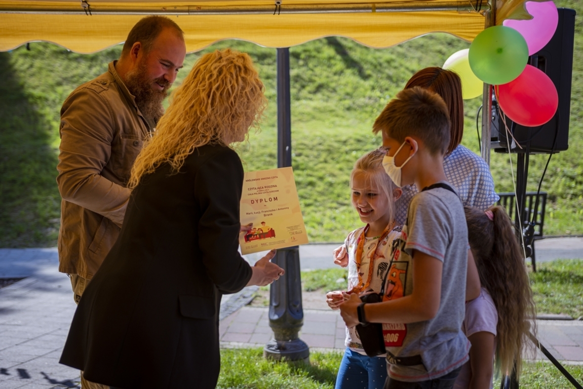 Piknik był też okazją, żeby podziękować Czytelnikom Biblioteki za ich aktywność. Rozdano dyplomy dla Czytających Rodzin z Gniezna (w ramach akcji cała Polska czyta dzieciom). Biblioteka uhonorowała także małą Ambasadorkę Czytania – Zosię Wróblewską. Jedenastoletnia Zosia jest jak „jednoosobowa agencja reklamowa czytania” – swoją pasją „zaraża” innych.