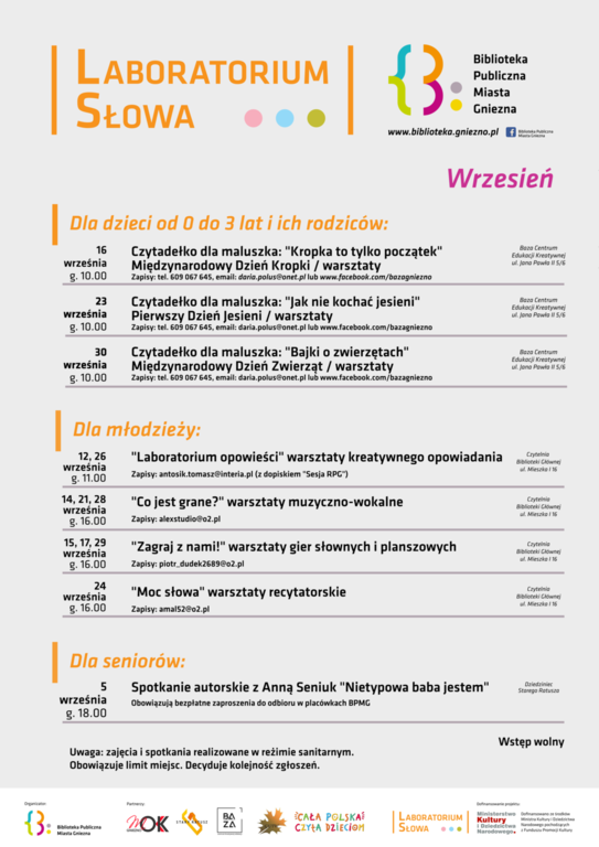 Warsztaty Biblioteki Publicznej Miasta Gniezna realizowane w ramach projektu “Laboratorium słowa” dofinansowano ze środków Ministra Kultury i Dziedzictwa Narodowego pochodzących z Funduszu Promocji Kultury.