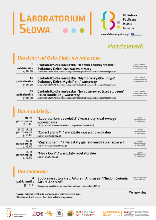 Warsztaty Biblioteki Publicznej Miasta Gniezna realizowane w ramach projektu “Laboratorium słowa” dofinansowano ze środków Ministra Kultury i Dziedzictwa Narodowego pochodzących z Funduszu Promocji Kultury.