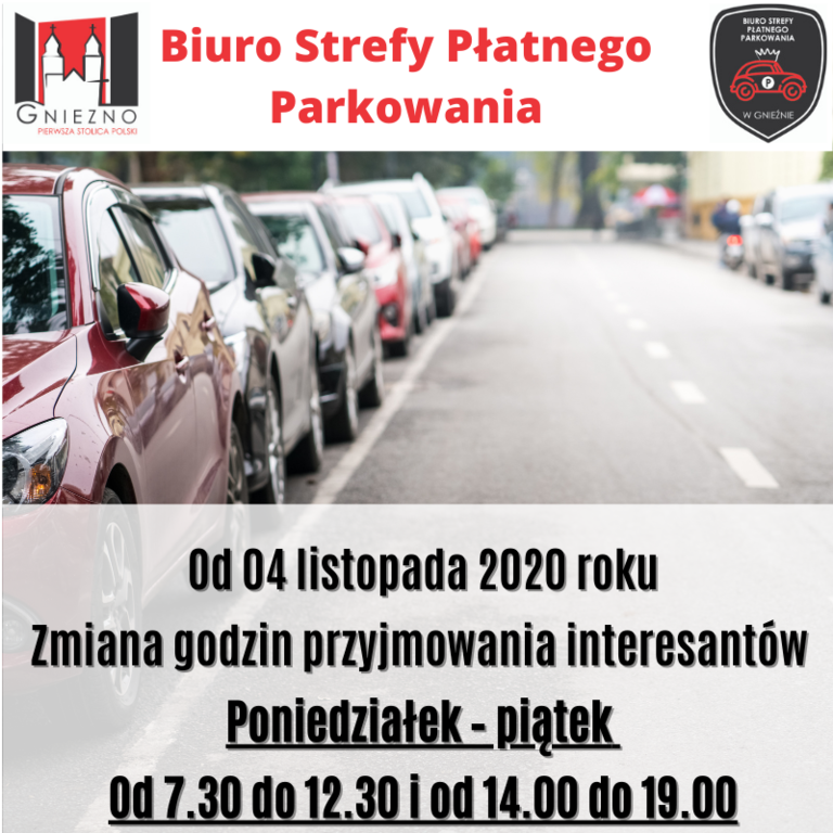 Od 4 listopada 2020 roku wprowadzone zostają nowe godziny przyjmowania interesantów w Biurze Strefy Płatnego Parkowania w Gnieźnie: poniedziałek - piątek, 7.30-12.30 oraz 14.00 do 19.00.