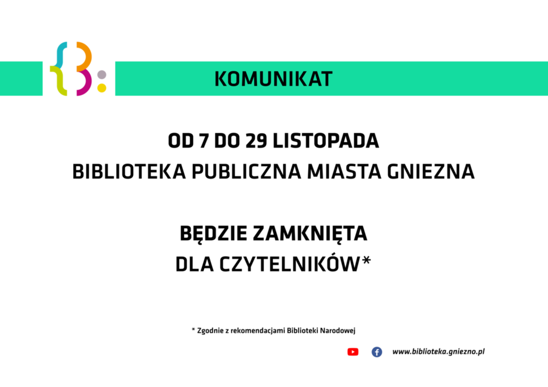 Biblioteka Publiczna Miasta Gniezna będzie nieczynna dla użytkowników od 7 do 29 listopada 2020. Realizuje tym samym rekomendacje Biblioteki Narodowej o całkowitym zamknięciu biblioteki dla użytkowników.