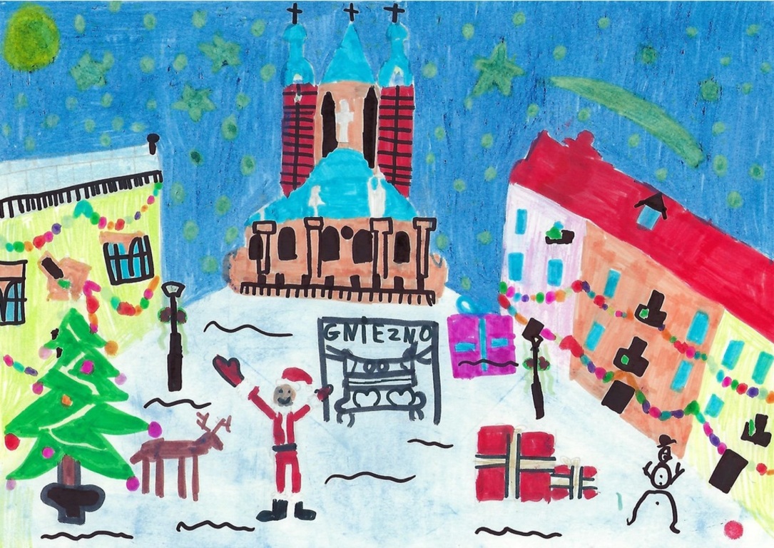 Przedstawiamy wyniki konkursu na miejską kartkę świąteczną, na który wpłynęło aż 70 prac z całego miasta. Pierwsze miejsce zdobył rysunek siedmioletniej Liwii Góral ze Szkoły Podstawowej nr 8 i to jej praca znajdzie się na oficjalnej kartce świątecznej Miasta Gniezna.
