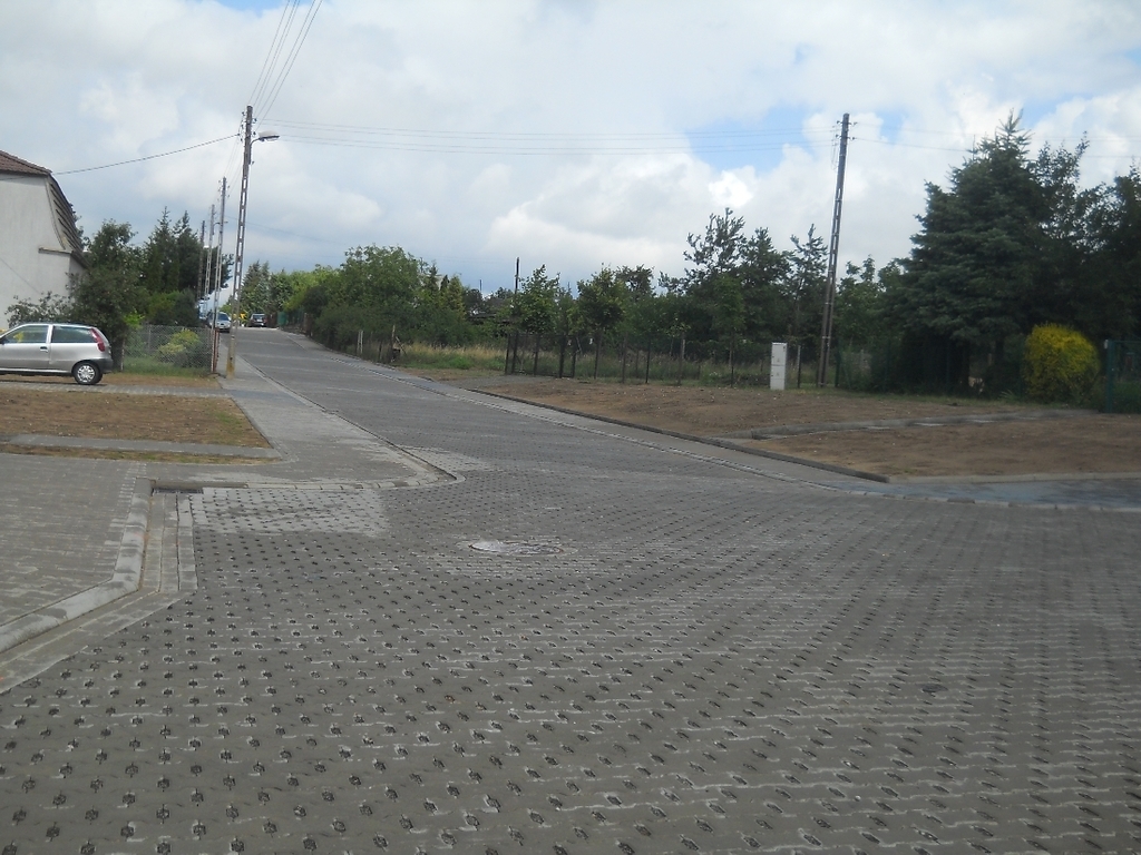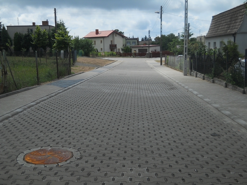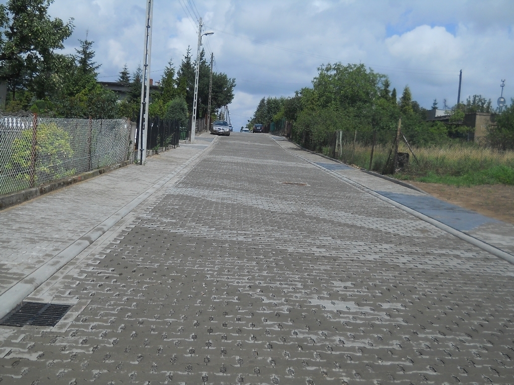 Położono także nawierzchnię chodników i dojść do posesji z kostki Domino szarej na podbudowie z kruszywa łamanego twardego (pow. 564,00 m2) i nawierzchnię zjazdów z kostki Domino grafitowej na podbudowie z kruszywa łamanego twardego (pow. 286,00 m2). Wykonano odwodnienie z: 4 studni zbiorczych dla wody opadowej, 7 sztuk wpustów ulicznych z przykanalikami, a także humusowanie terenów zielonych na powierzchni 498,60 m2.