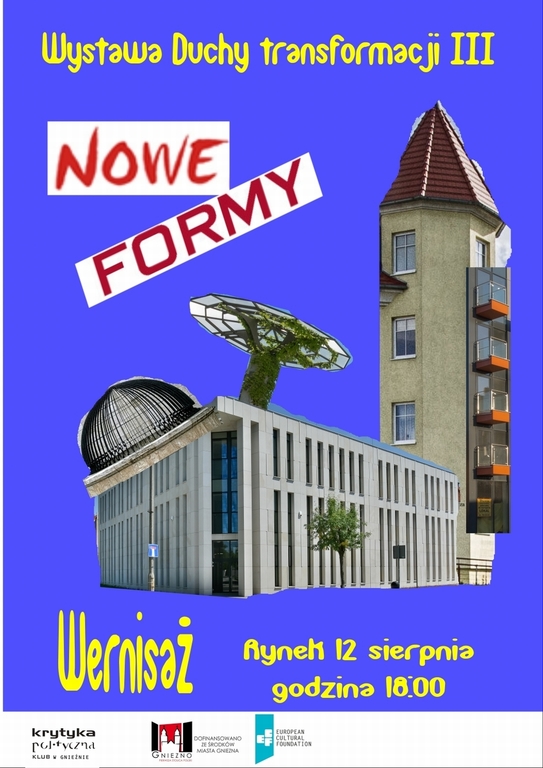 Już po raz trzeci Klub Krytyki Politycznej wywołuje „Duchy transformacji...” i zaprasza na ich wizualny pokaz. Tym razem po obrazach sześciu gnieźnieńskich fabryk („Duchy transformacji – praca”) i architektury modernizmu, która powstawała u nas w czasie PRL-u i jest obecna również we współczesnym Gnieźnie („Duchy transformacji – rewolucja”) - dochodzimy do teraźniejszości. Pod hasłem „nowe formy”, kryje się architektoniczny postmodernizm, przez którego realizacje organizatorzy opowiadają o zmianach i społeczeństwie. Wernisaż wystawy: 12 sierpnia 2016, piątek, 18.00, Rynek, Gniezno.