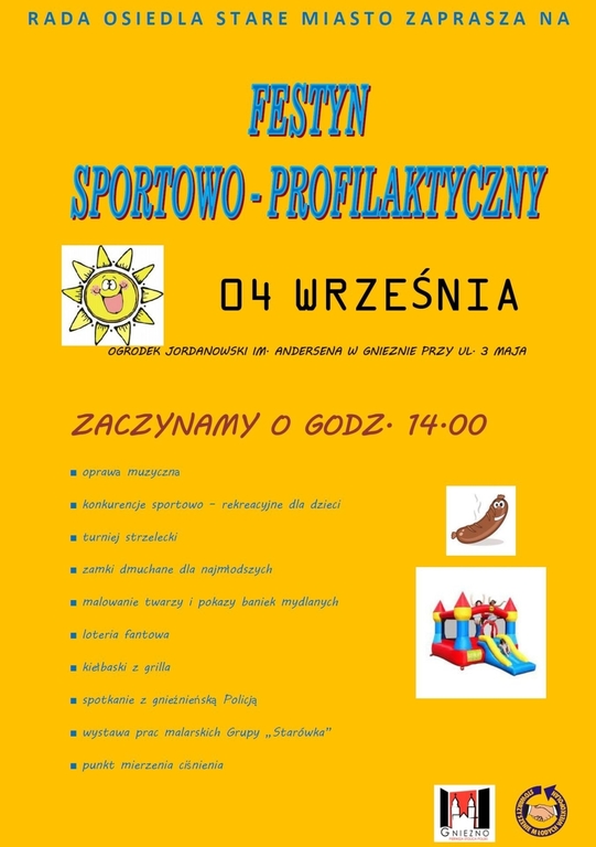 Gnieźnieńska Rada Osiedla „Stare Miasto” przy współorganizacji Urzędu Miejskiego i Stowarzyszenia Młodych Wielkopolan serdecznie zaprasza mieszkańców miasta i powiatu gnieźnieńskiego na coroczny Festyn Sportowo – Profilaktyczny, który tym razem odbędzie się 4 września na terenie Ogródka Jordanowskiego w Gnieźnie przy ul. 3 Maja. Początek o 14.00